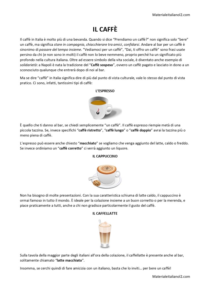 Questa comprensione scritta, adatta a un livello B1 pieno/B2 , tratta il tema del caffè in Italia: perché è così importante? Quanti tipi di caffè ci sono? Per la comprensione è stato pensato un esercizio a risposta multipla, presente nella versione scaricabile.