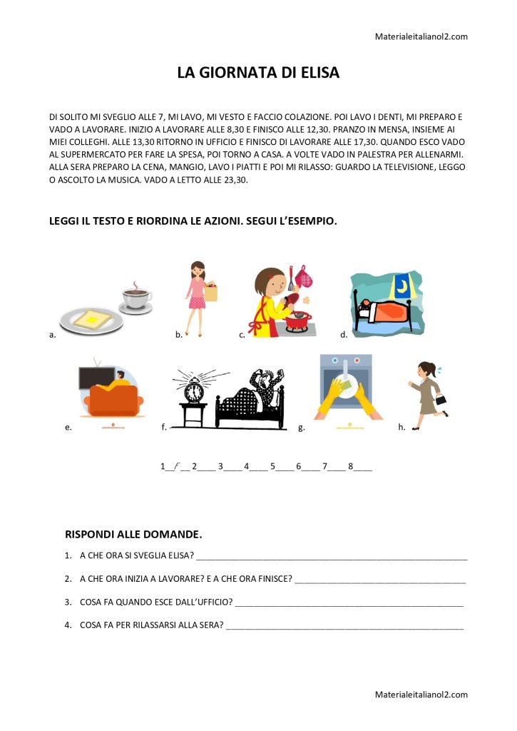 Questa comprensione tratta il tema descrizione della giornata. Utilizza verbi riflessivi, orari, per+infinito, ed è quindi adatta per un livello A1-A2. Sono presenti due esercizi: il riordino delle immagini corrispondenti alle azioni, per verificare la comprensione lessicale; delle domande a risposta aperta che, oltre alla comprensione, permettono l’allenamento della declinazione dei verbi, esseno richiesta la trasformazione da prima a terza persona. Chiaramente, a seconda del livello, può essere richiesta, in quest’ultimo esercizio, una risposta meno completa.