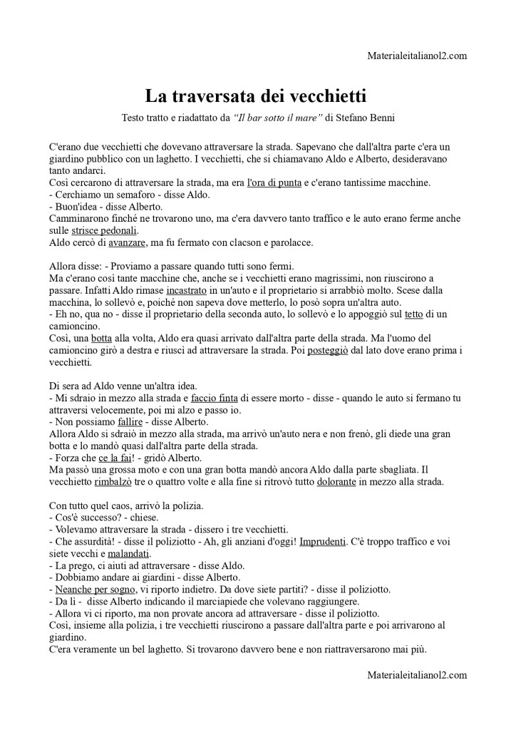 Questo testo riadattato dall’originale di Stefano Benni è adatto a un livello A2. Questa versione presenta delle parole sottolineate per la cui comprensione è proposto un esercizio di collegamento parola-definizione (disponibile per il download).