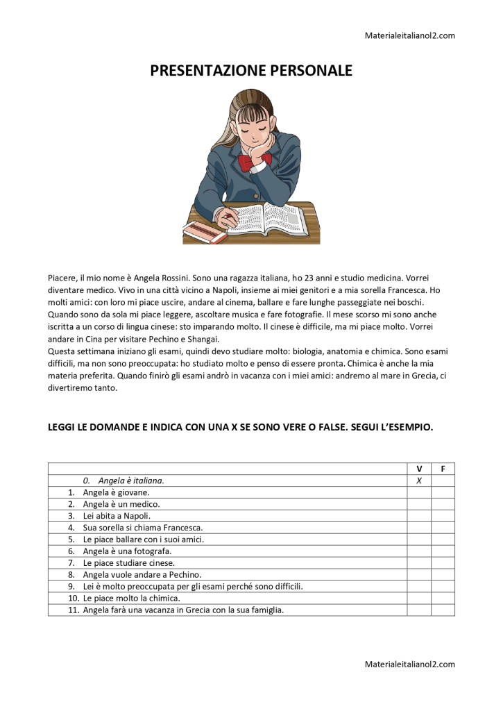 Esempio di comprensione scritta a tema presentazione personale con esercizio V/F. Contiene presente, passato prossimo, futuro semplice e verbi modali, quindi è adatta ad un livello A2. Può essere utilizzata anche modello per la produzione scritta e/o orale su questo tema.
