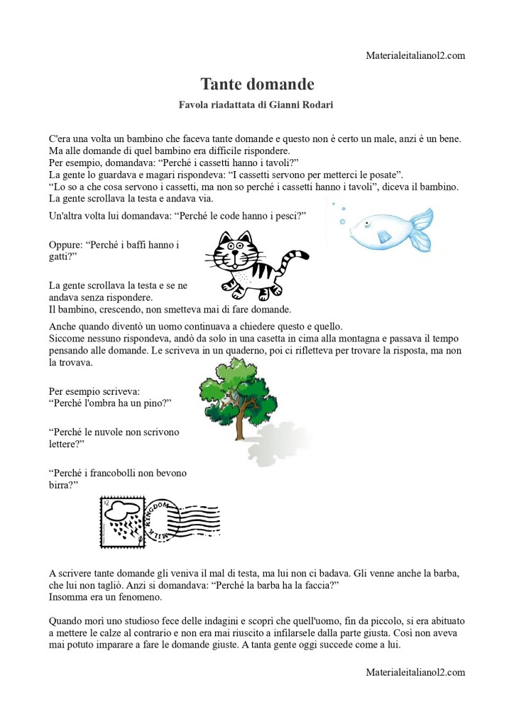 Questo testo, riadattato dall’originale di Gianni Rodari, è adatto per un livello A1-A2, ed è accompagnato da un esercizio (disponibile per il download) che vuole sollecitare allo stesso tempo la comprensione logica e l’uso della lingua. Nel testo compaiono anche immagini per semplificare la comprensione dei termini meno comuni.
