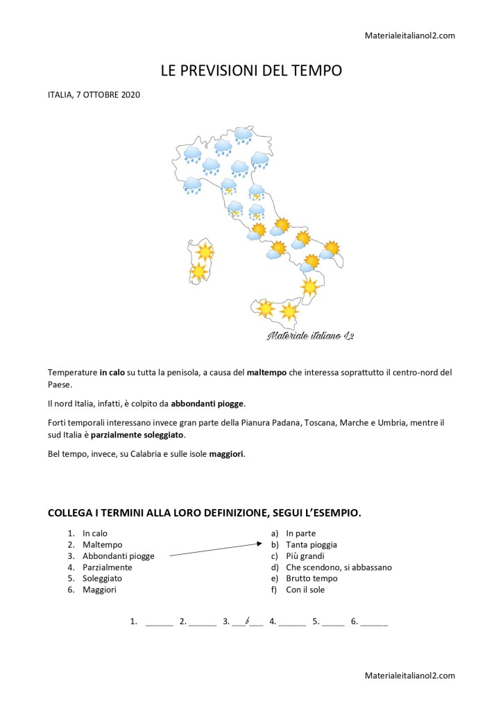 Questo piccolo testo è un esempio, semplificato ed inventato, di previsioni del meteo in italiano. Per la comprensione dei termini in grassetto, è proposto un esercizio di abbinamento parola-definizione. In affiancamento, è consigliato lo studio della tavola lessicale a tema stagioni e meteo, presente nella pagina LESSICO.