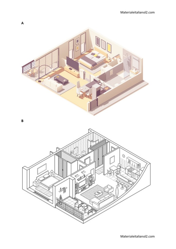 Comprensione scritta a tema casa. Nel testo vi è la descrizione di un appartamento, con l’utilizzo del lessico della casa e degli avverbi di luogo. L’attenta lettura dovrebbe permettere agli studenti di individuare quale dei due appartamenti rappresentati in figura è quello descritto nel testo, osservandone le differenze. Non essendo semplicissimo è adatto a un livello A1 alto/A2. Seguono poi esercizi di abbinamento parola/immagine per la comprensione dei verbi legati alla casa e di sinonimi per la comprensione di nuove parole.