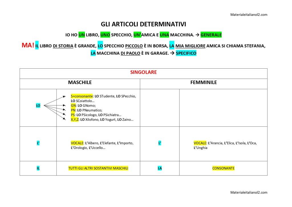 Tabella degli articoli determinativi italiani con confronto tra indeterminativi e determinativi. Nella versione scaricabile sono presenti due pagine con la trasformazione al plurale e un esercizio di inserimento.