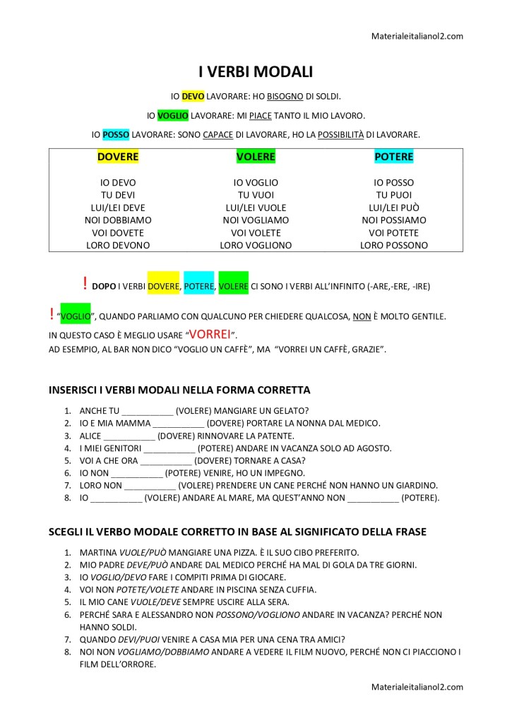 Questa schema presenta l’uso e la coniugazione dei verbi modali italiani. Son proposti due esercizi differenti: uno volto a verificare la conoscenza della forma dei verbi, uno per la verifica dell’uso.
