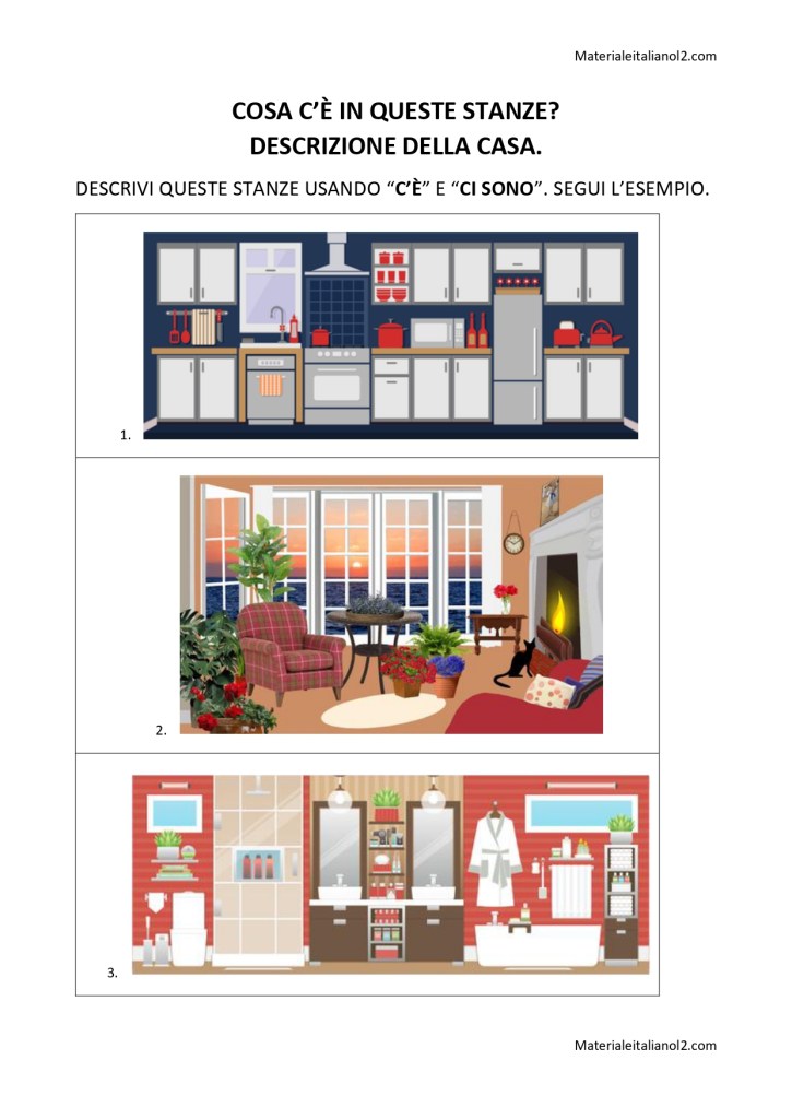 Questo esercizio vuole stimolare la produzione scritta e/o orale sul tema arredamento. Nella versione scaricabile è presente un esempio di descrizione da seguire. A seconda del livello degli studenti e delle necessità può essere richiesto un elenco degli oggetti, l’utilizzo di “C’è”/”Ci sono”, preposizioni o locuzioni avverbiali di luogo, numeri, colori, grandezze, ecc. Può essere svolto da soli o in coppia (ad esempio, con domande tipo “Cosa c’è in…?”, “Cosa vedi in…?”, “Dov’è/Dove sono…?”).