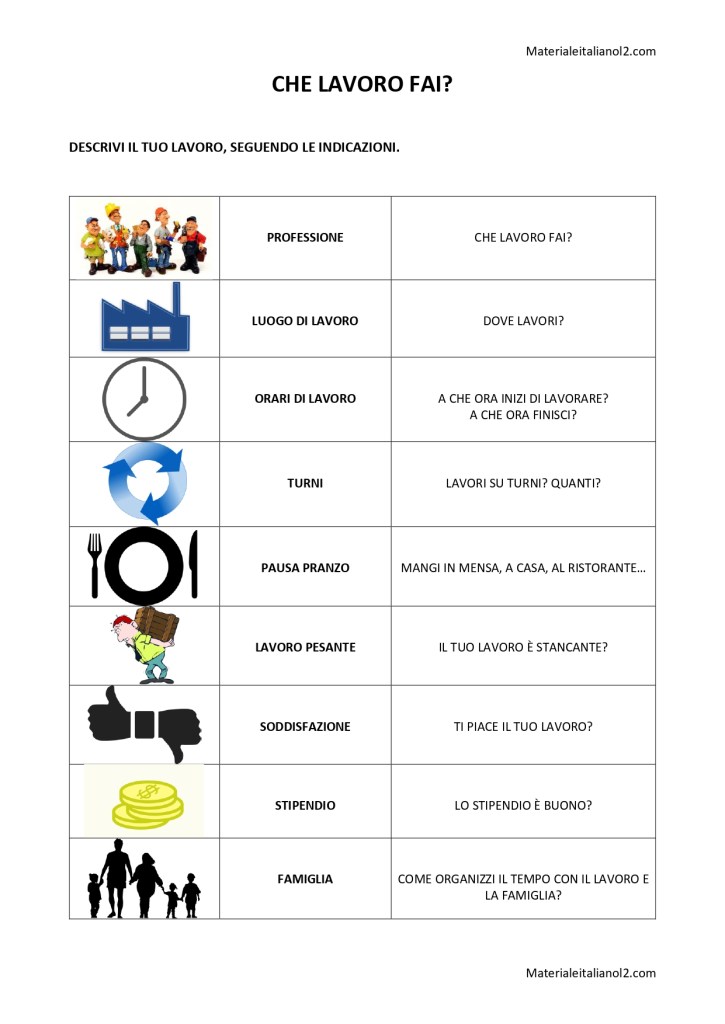 Attività per la produzione scritta e/o orale sul tema lavoro e professioni. Può essere richiesta una produzione più o meno elaborata, a seconda della disponibilità lessicale, il livello e la scolarizzazione degli studenti.