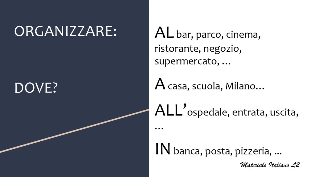 Spunti per la produzione scritta e/o orale. Come invitare qualcuno, come organizzare un appuntamento (Dove? con breve riepilogo delle preposizioni di luogo; Quando? con ripasso preposizioni di tempo; A che ora? con spiegazione di come leggere le ore), come accettare o rifiutare gentilmente, giustificandosi, un invito.